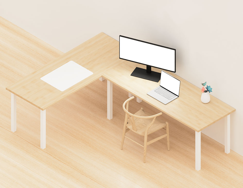 今回はパソコン作業と手作業をシームレスに行えるL字配置デスクを制作した。