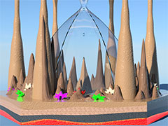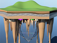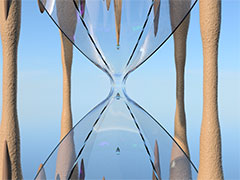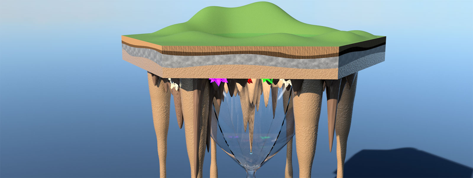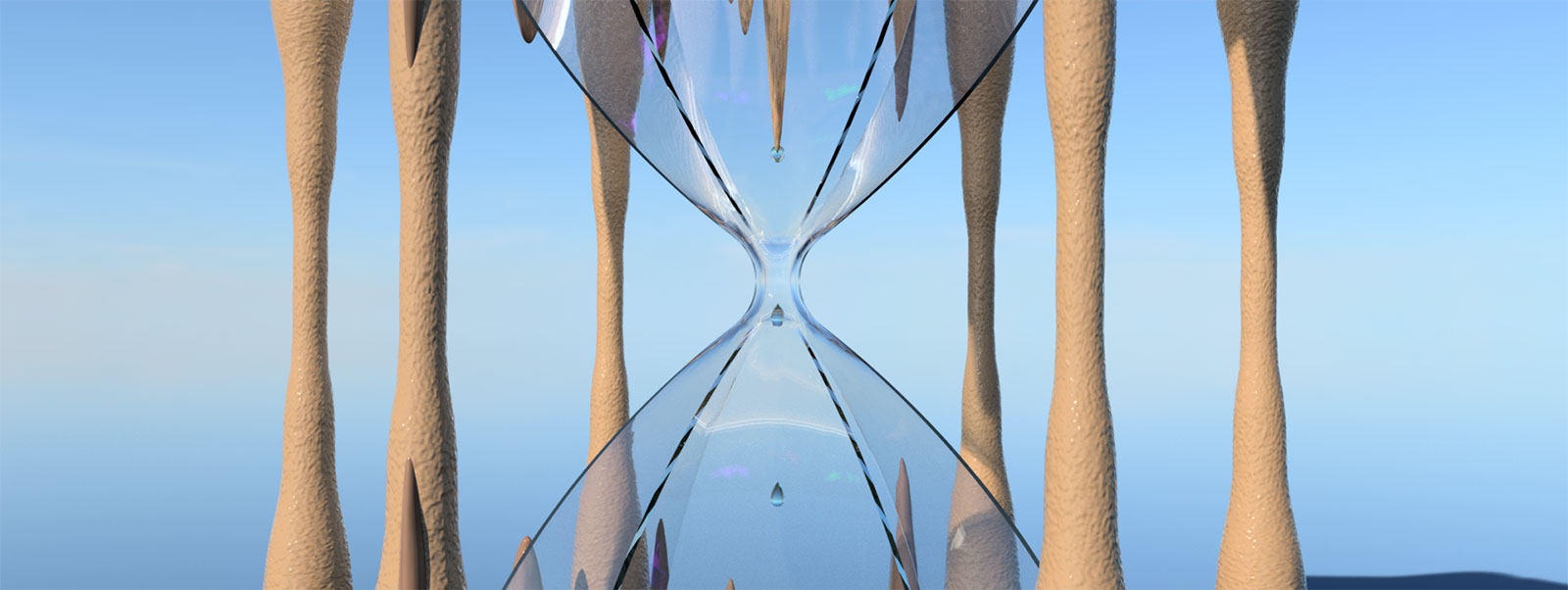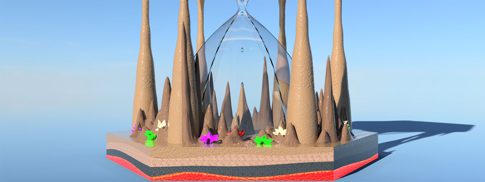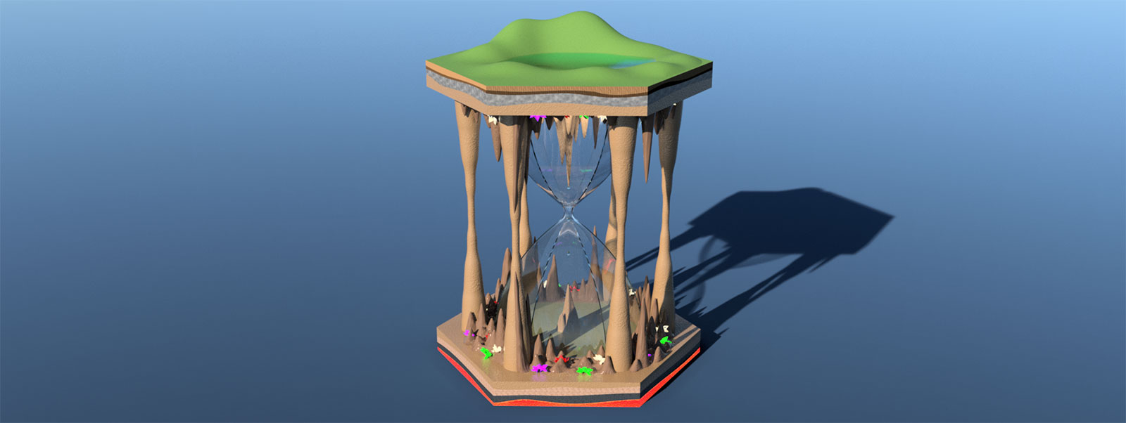 今回作ったものは山に囲われた湖の水が地面に染みて、天井に鍾乳石が出来て、そこから垂れた水滴で、地面に石筍ができていく砂時計です。