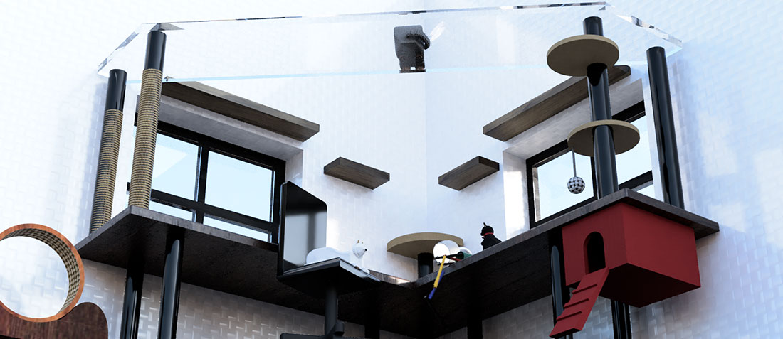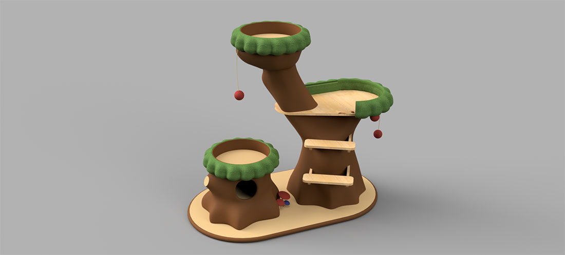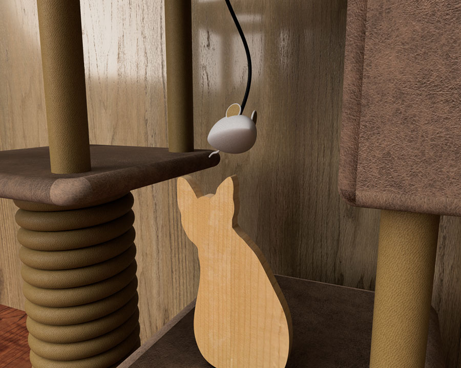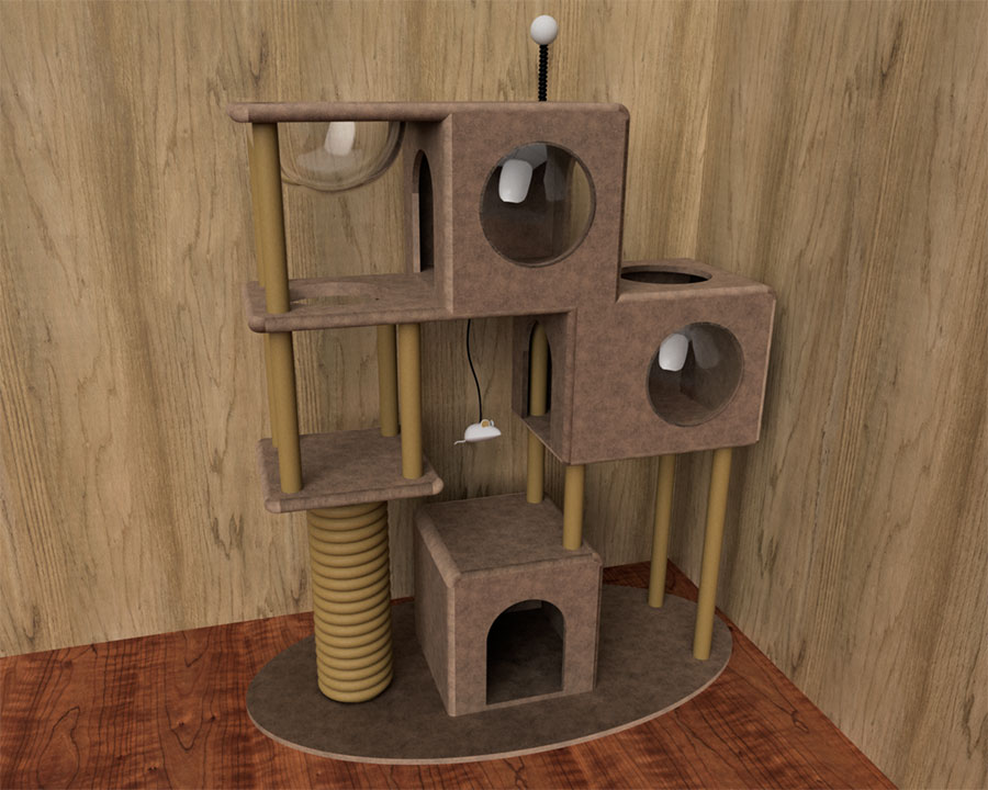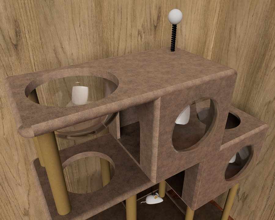 猫が好きに過ごせるようなキャットタワーを作りました。真ん中にネズミのおもちゃをぶら下げたり、一番上に半球の過ごしやすい場所を設置したりしました。また、猫のシルエットを作り使用している様子をイメージしやすいようにしました。