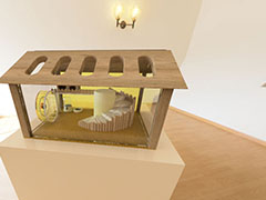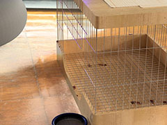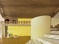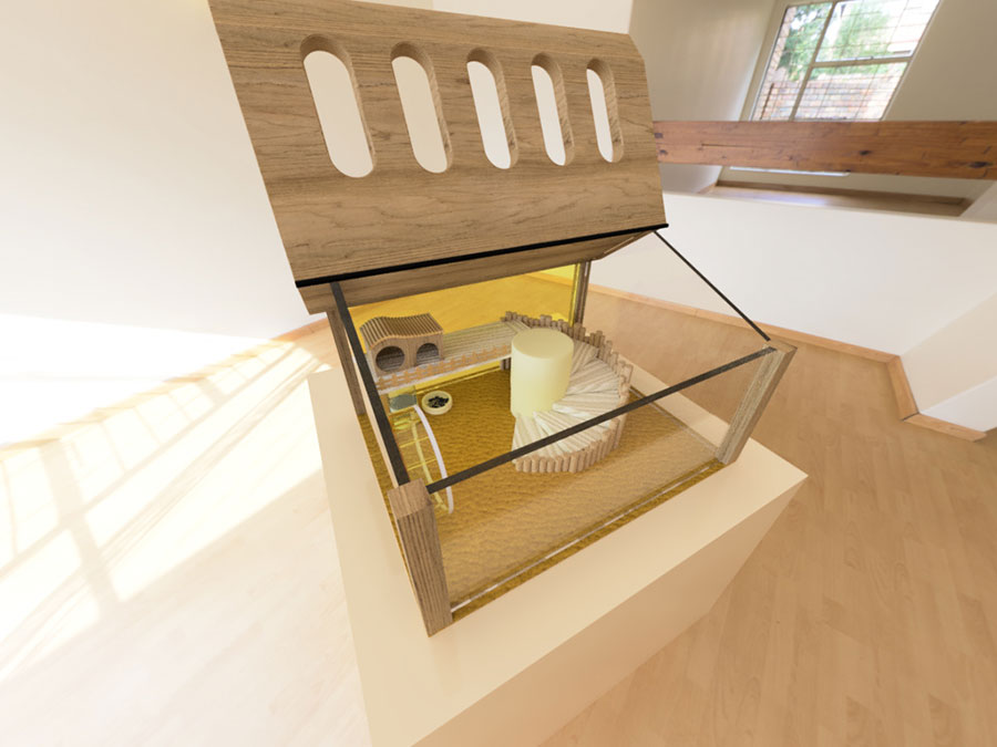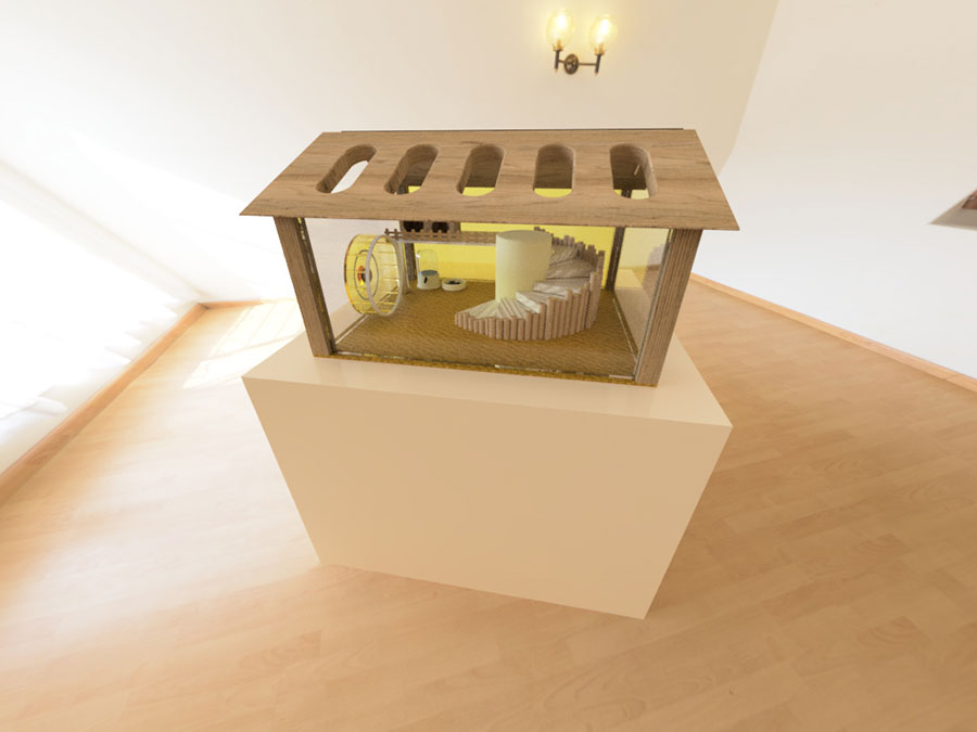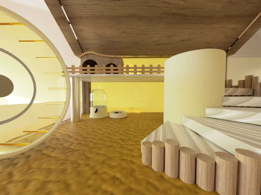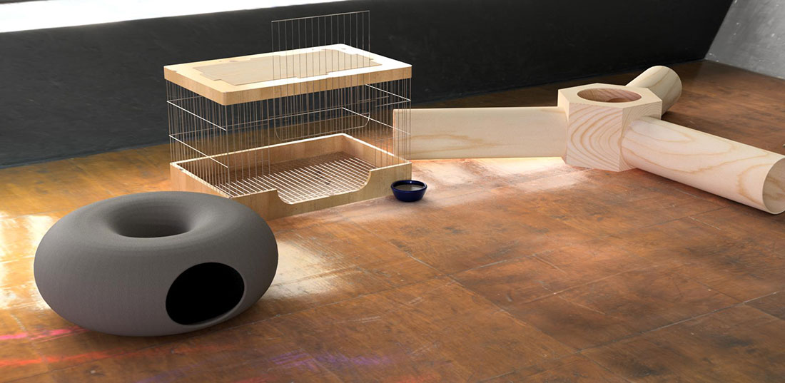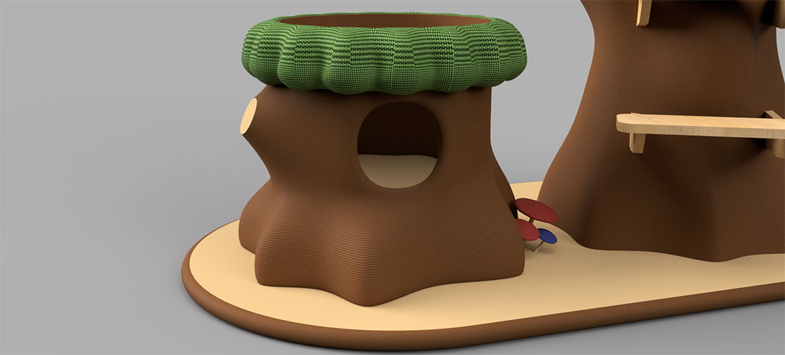 猫が好きに過ごせるようなキャットタワーを作りました。真ん中にネズミのおもちゃをぶら下げたり、一番上に半球の過ごしやすい場所を設置したりしました。また、猫のシルエットを作り使用している様子をイメージしやすいようにしました。