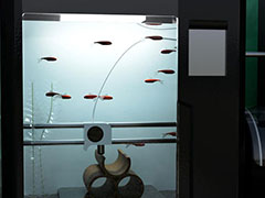 右の水槽には恐竜の骨が入っていてうなぎが居ます。