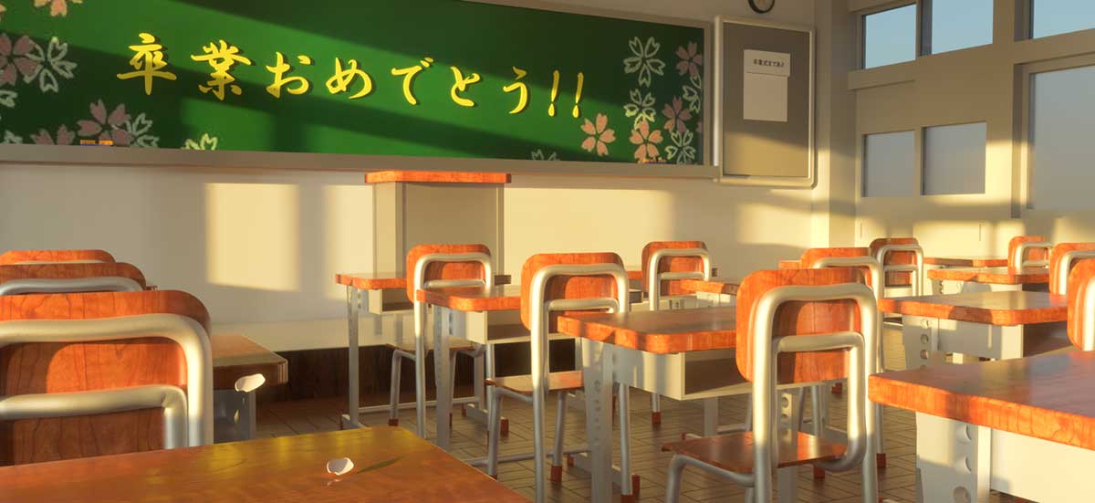そのときの朝日の入り方や、窓が少し空いていて、桜の花びらが教室に入って来ていたシーンを鮮明に覚えていたので、その風景を再現してみました。