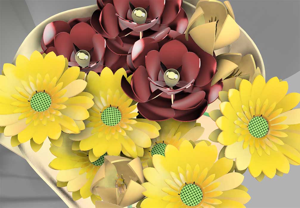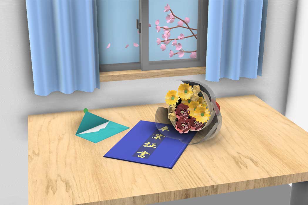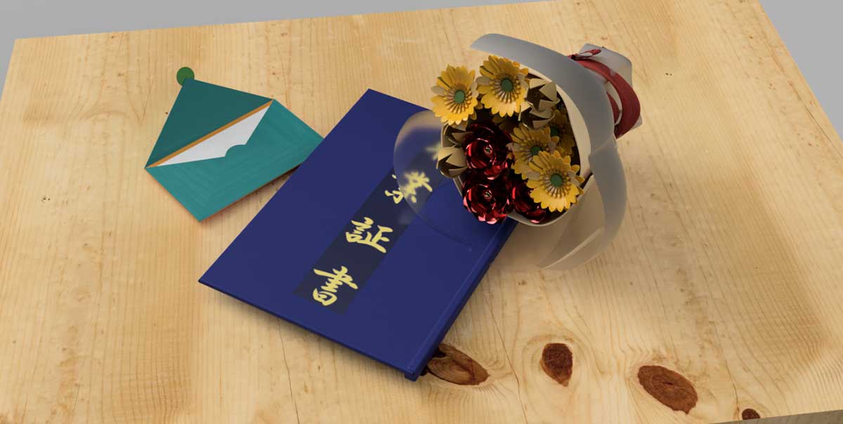 卒業式の日、黒板に大きく「卒業おめでとう!!」と書かれていました。そのときの朝日の入り方や、窓が少し空いていて、桜の花びらが教室に入って来ていたシーンを鮮明に覚えていたので、その風景を再現してみました。こだわったポイントとしては、椅子の骨組みの形をフォームモデリングで作ったのですが、柔らかい雰囲気を出すために何度も試作品を作り、少し丸みを帯びた形に仕上げました。
