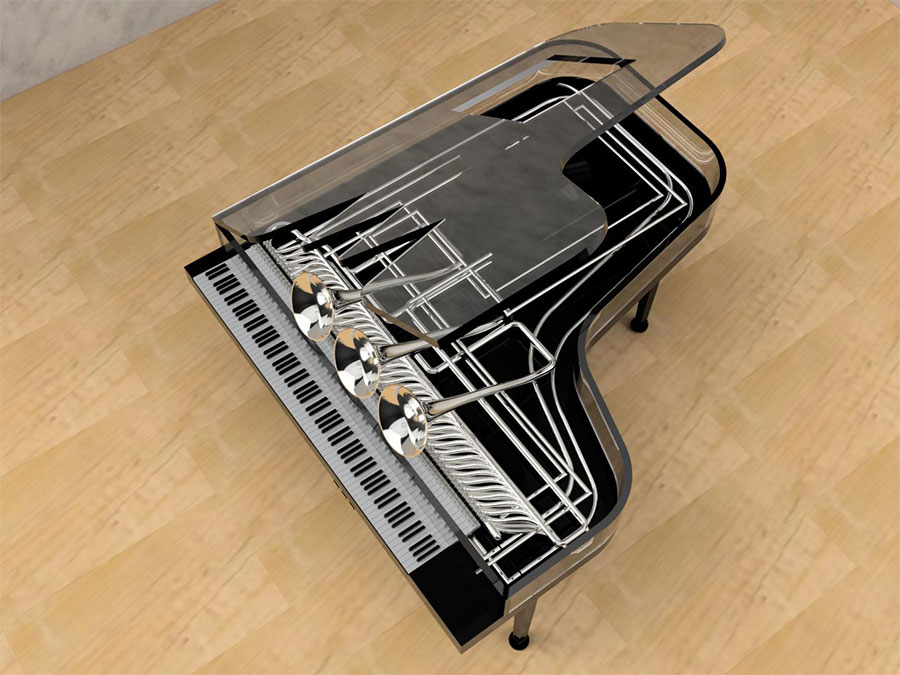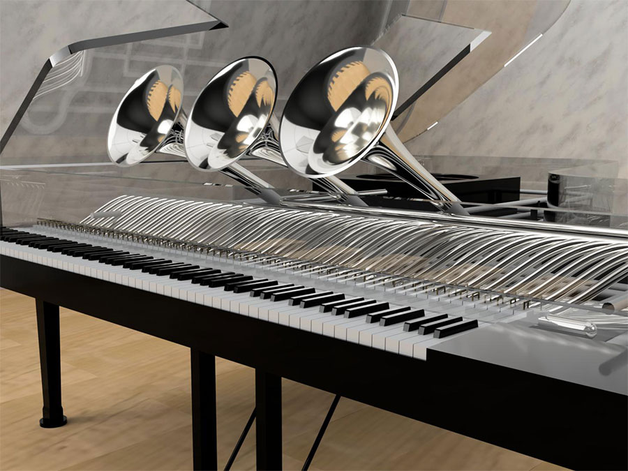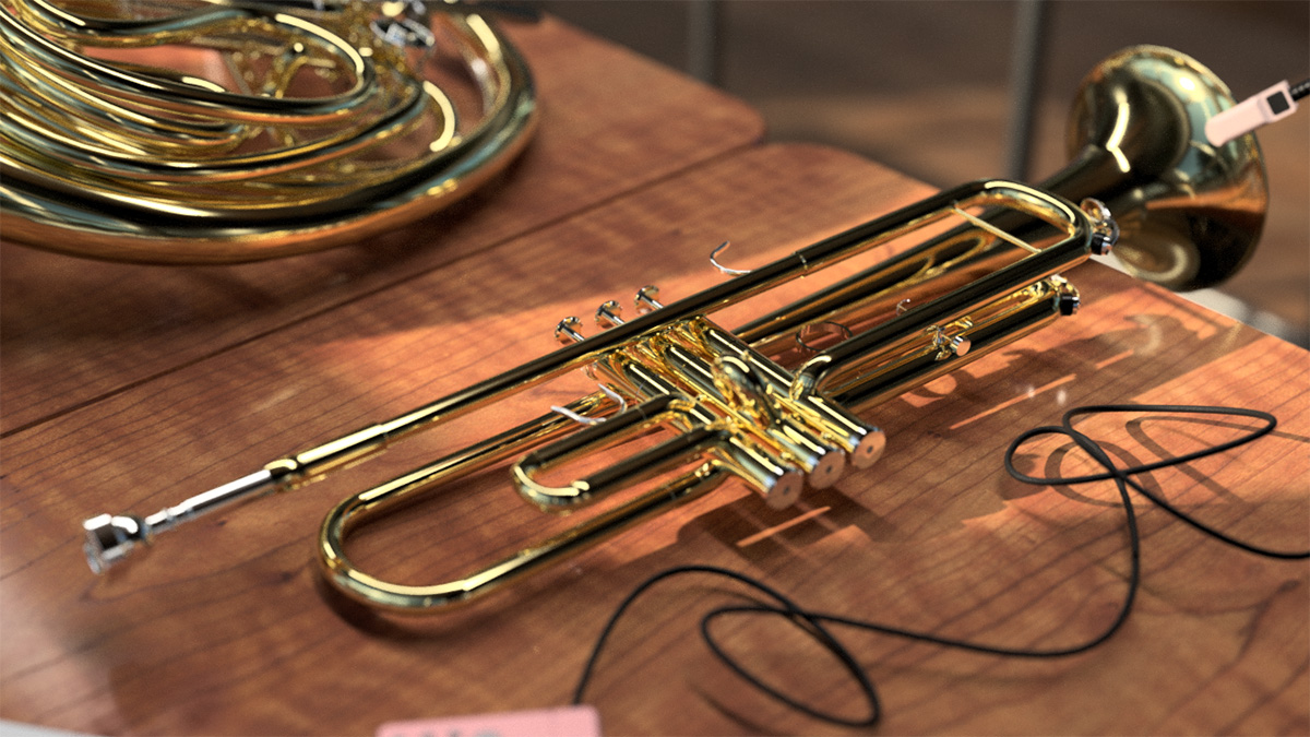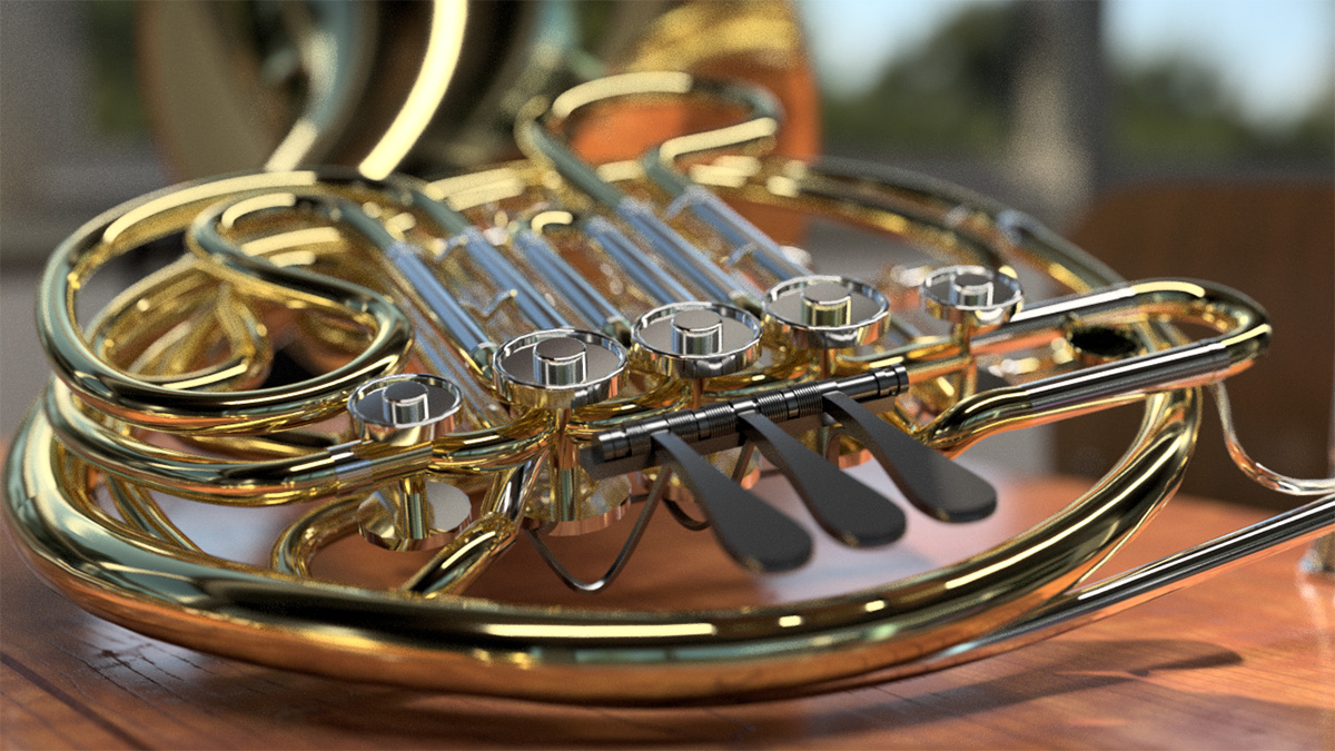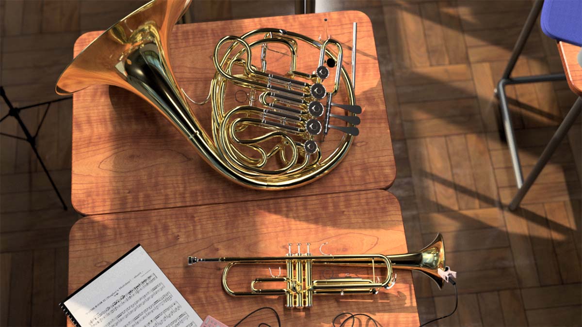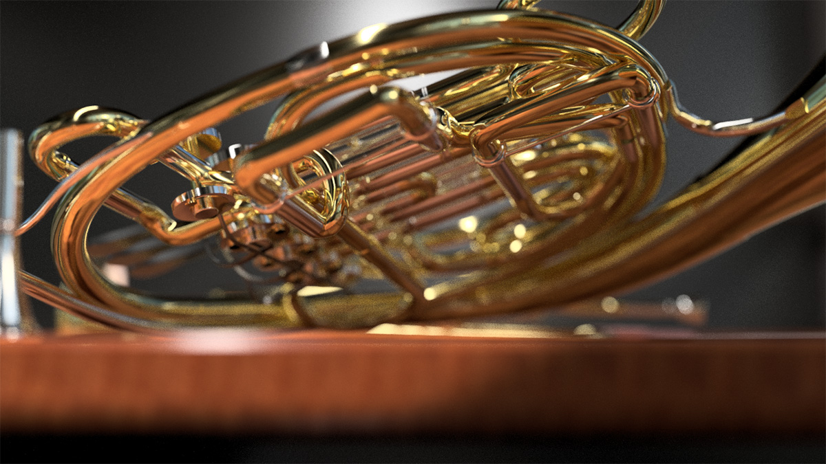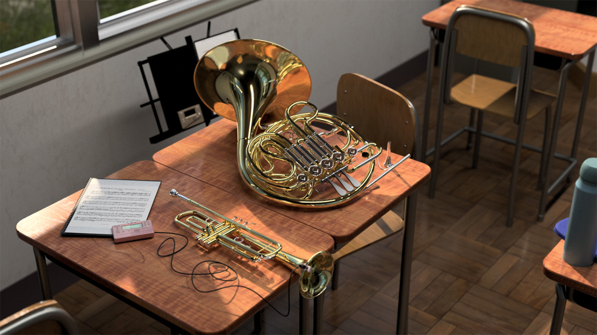 シンプルな形状のトランペットに対し、ホルンは構造が非常に複雑なため、資料を多く集め、よりリアルに見えるよう工夫しています。