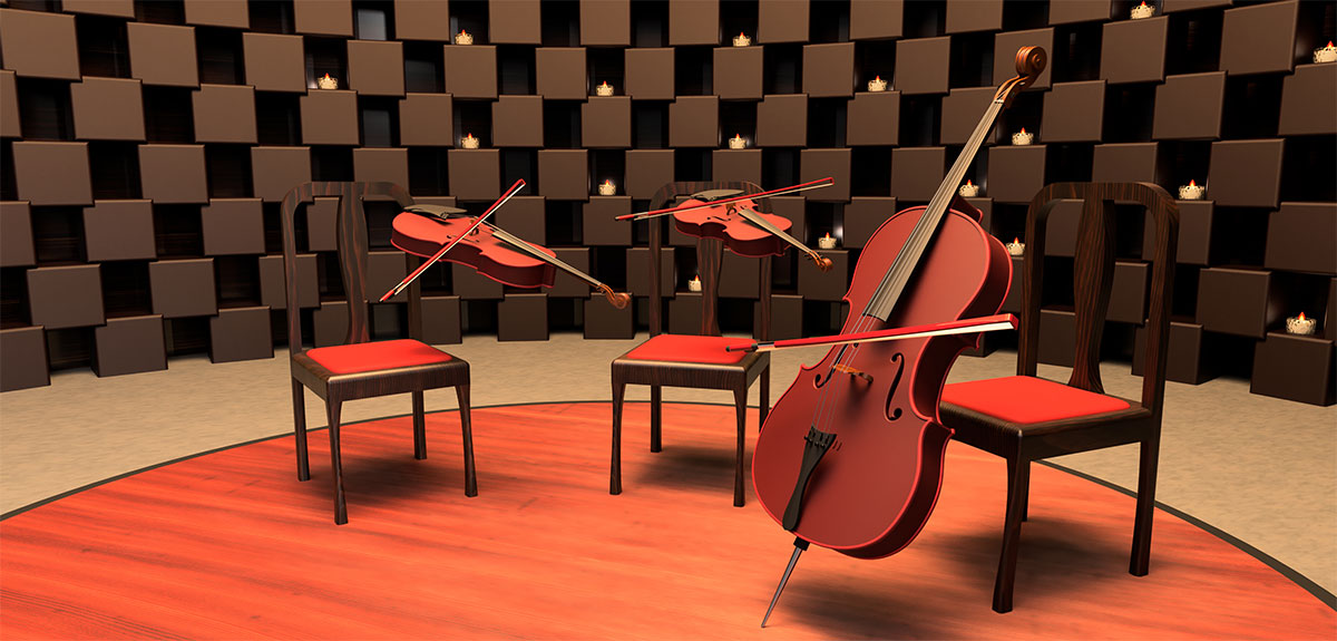 誰もいないはずのステージで奏でられるヴィオラ、ヴァイオリン、チェロの三重奏。