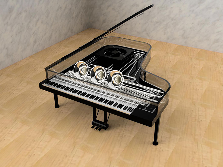 こだわったポイントとしては、何度も三重奏の演奏の映像を見直して、まるで奥に弾いている人がいると錯覚するように楽器や弓を配置しました。