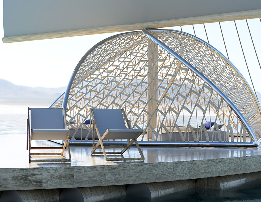 ドームの骨組みにはねじれを加え、美しく見えるようにしました。
