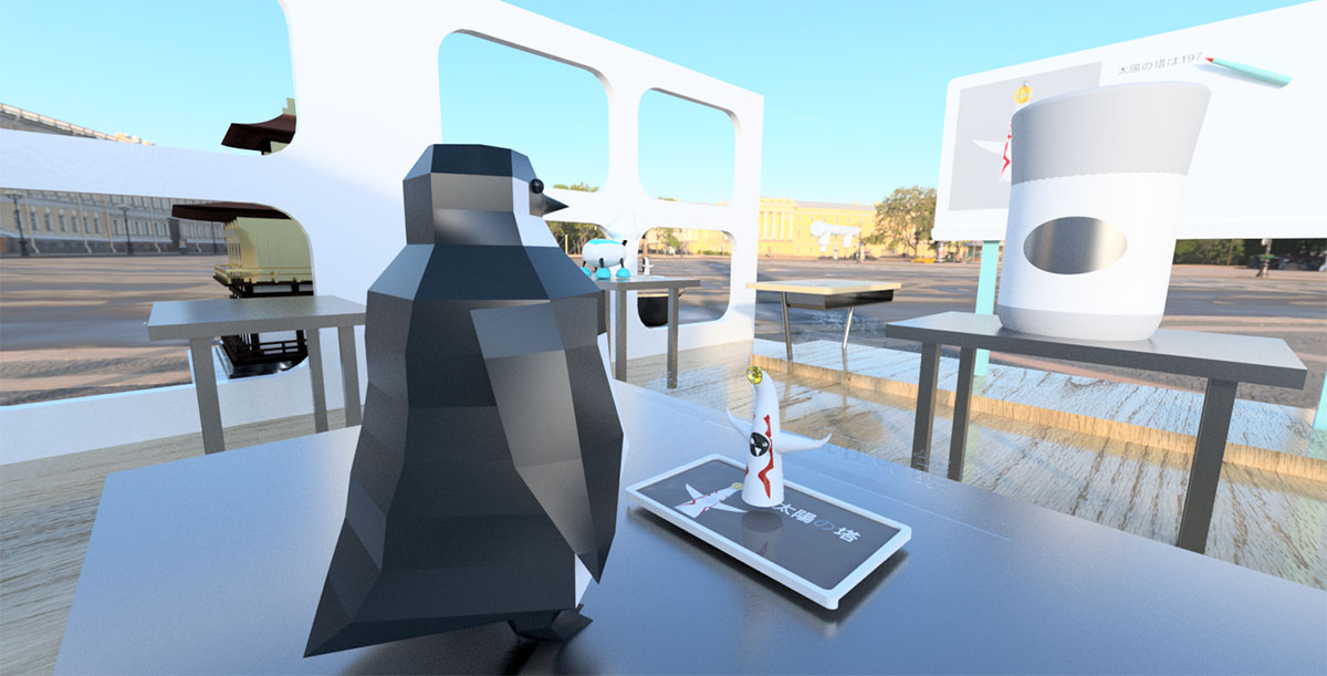 こだわりはレンダリングにも詰まっています。宇宙ステーションのレンダリングでは光る素材でできた球を矩形状パターンで無数に増やすことで星の瞬く宇宙を表現しました。海中の表現には特にこだわっており、試⾏錯誤の末、対象物を海⾯のマテリアルで覆った後、それをさらにLEDのマテリアルで覆うという⽅法に辿り着きました。