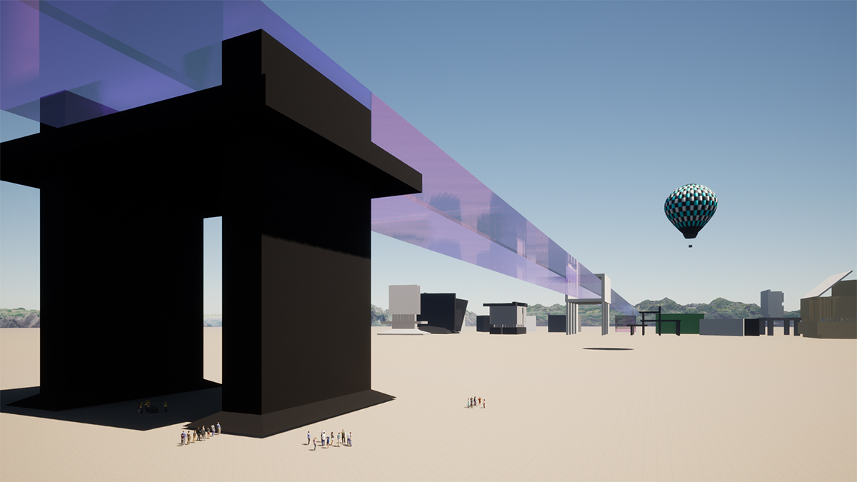 宇宙との架け橋には軌道エレベーターを採⽤し、宇宙ステーションに接続しました。これにより⽔上都市の中央にインパクトが⽣まれました。